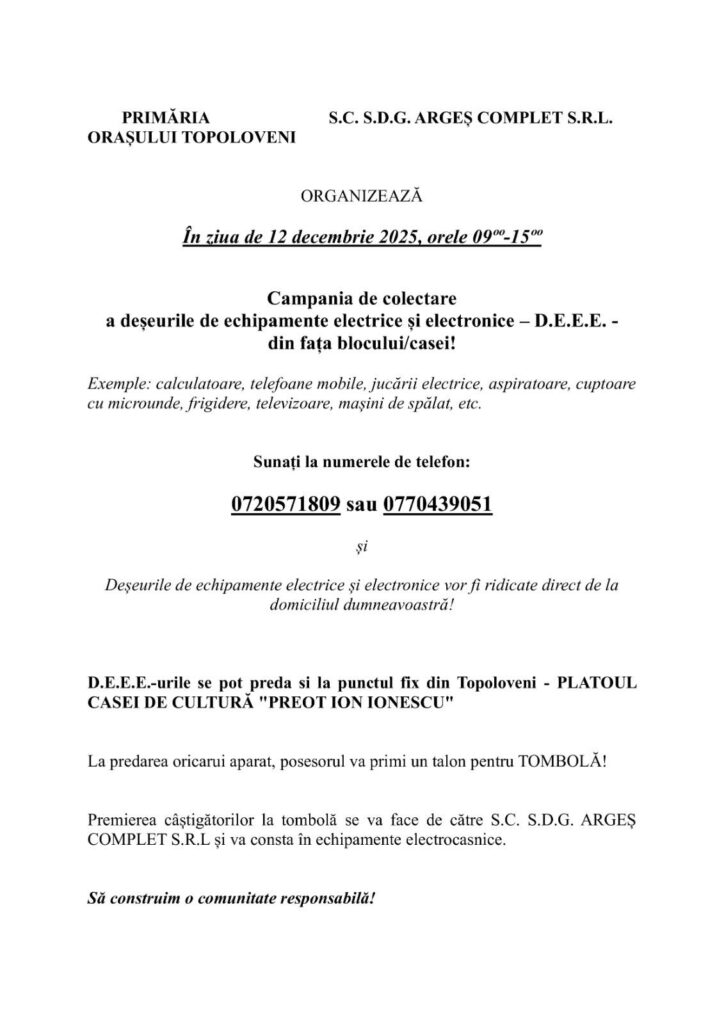 Primăria Topoloveni și SDG Argeș organizează în data de 12 decembrie 2025, între orele 9 și 15, o nouă campanie de colectare a DEEE-urilor din fața blocului/casei.