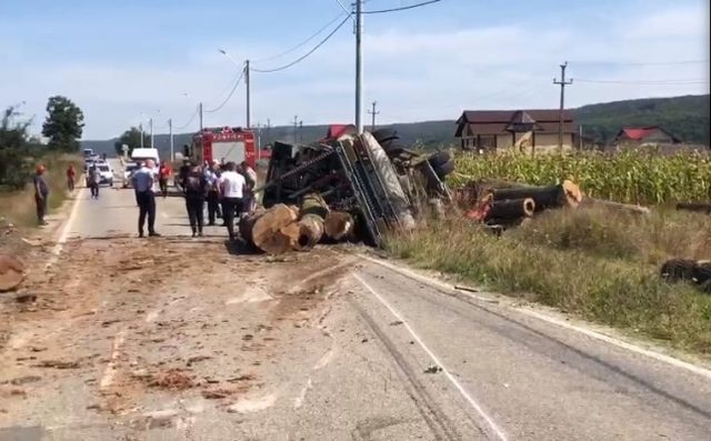 Un camion cu lemne s-a răsturnat în județul Argeș, pe DN73 D, în Țitești (către Davidești). O femeie a fost grav rănită grav de buştenii ajunşi pe carosabil.